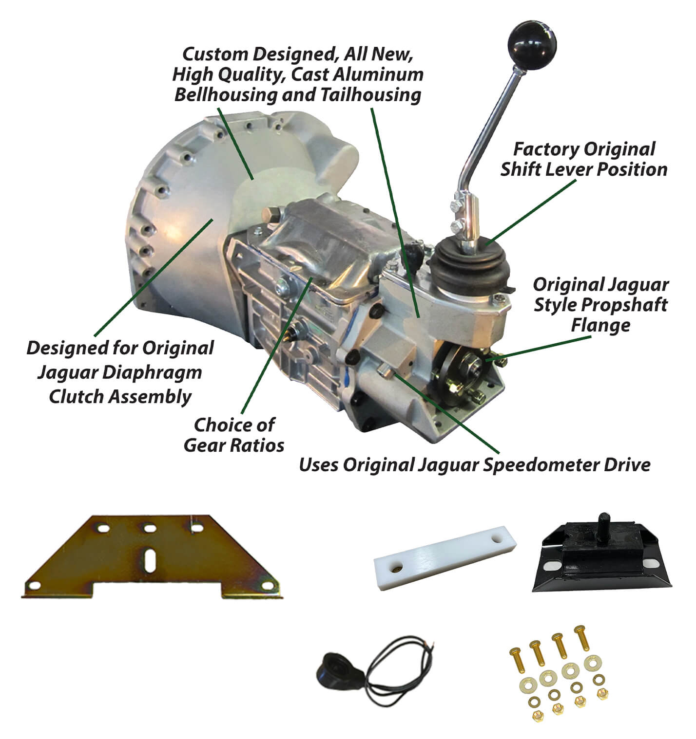 Custom built 5 speed – correctly fits Jaguar E Type 1961 – 1964 3.8lt 6-cylinder, Ratios 2.95, 1.94, 1.34, 1.00, .73